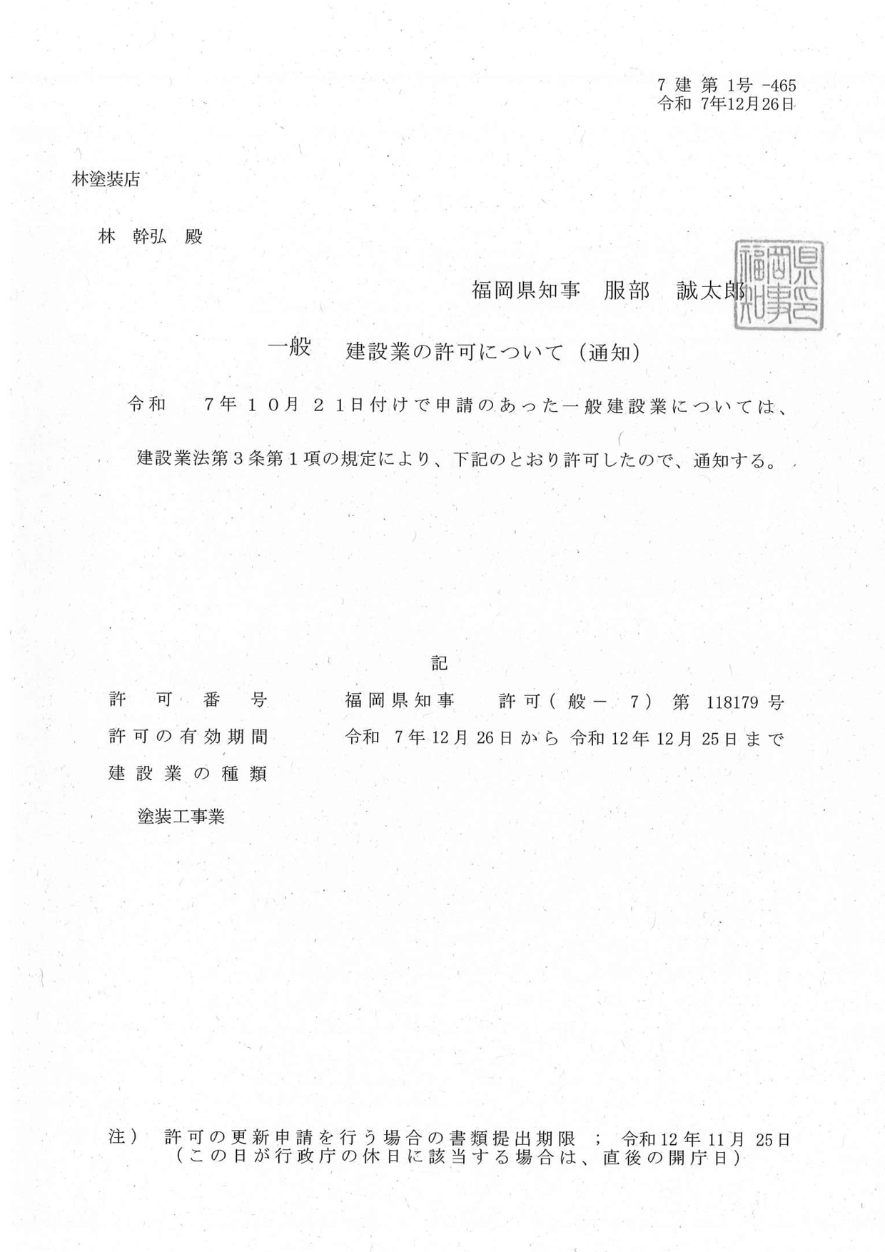 この度弊社は、建設業許可を取得いたしました。お客様のご期待に応えるべく、誠心誠意努めてまいります。 許可番号:福岡県知事許可(般-7)第118179号有効期限:令和7年12月26日~令和12年12月25日まで建設業の種類:塗装工事業